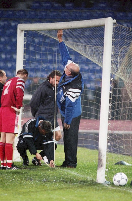 Инспектор УЕФА и судья матча измеряют ворота перед игрой «Спартака» и «Сьона». 1997 год