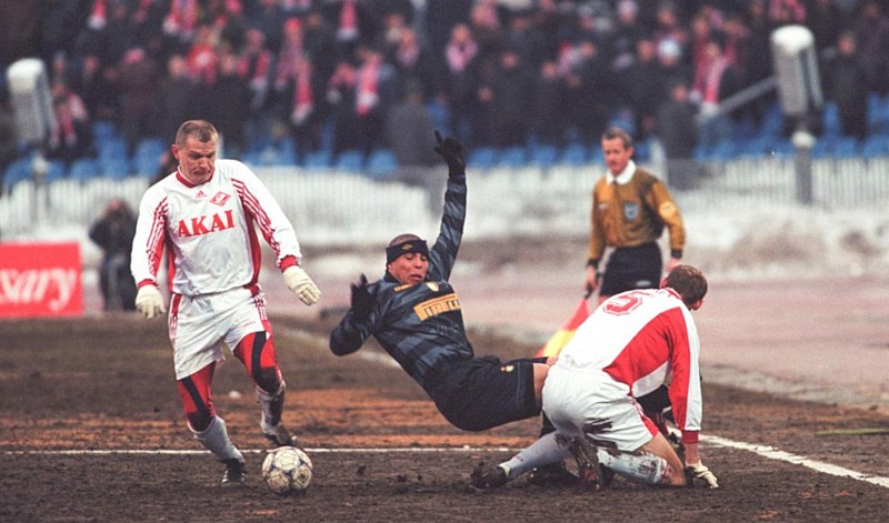 Защитник «Спартака» Сергей Горлукович отбирает мяч у нападающего «Интера» Роналдо. 1998 год