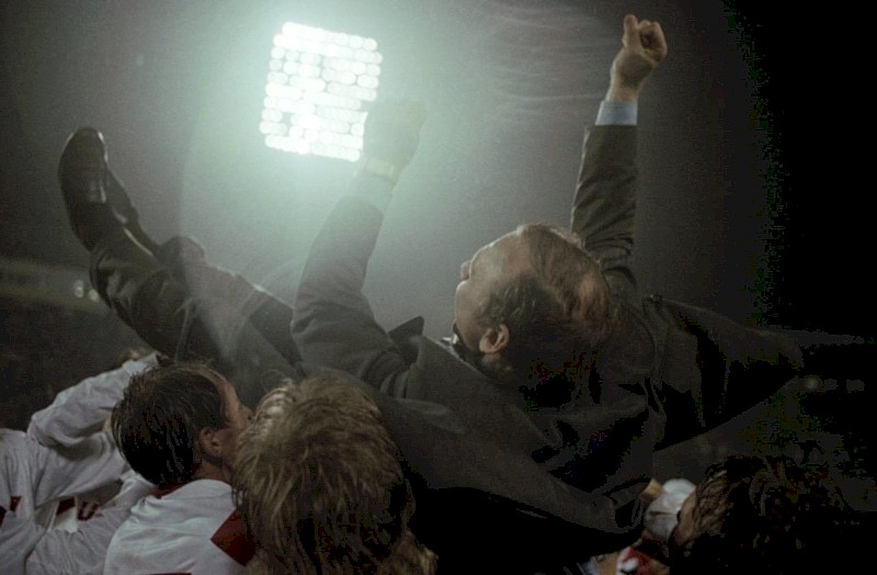 Футболисты «Спартака» качают Олега Романцева после победы над «Локомотивом», которая гарантировала им первый титул чемпионов России. 1992 год