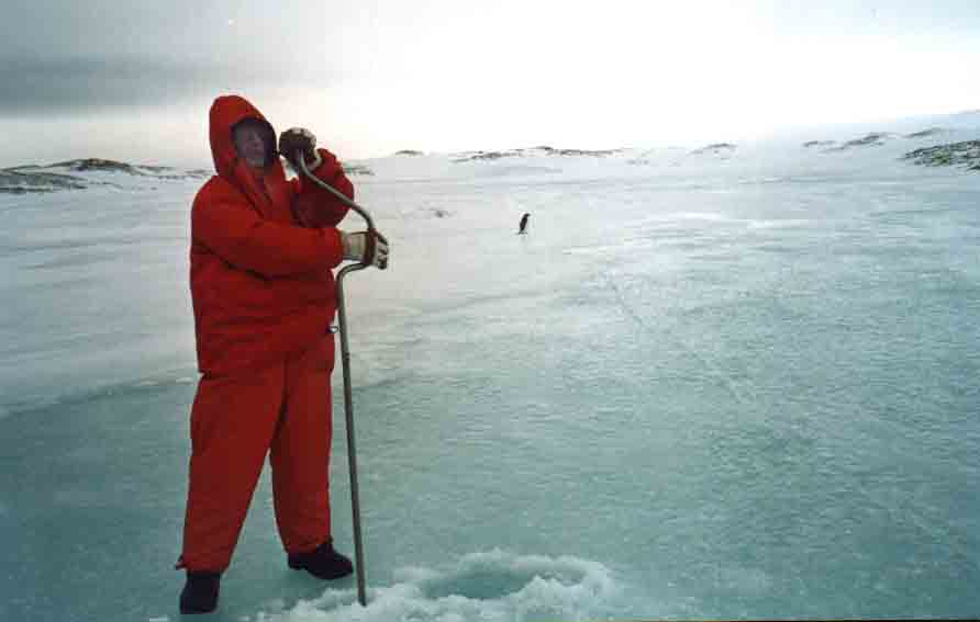 30. Бурение озёрного льда. Вдали пингвин Адели, наблюдает за нашей работой