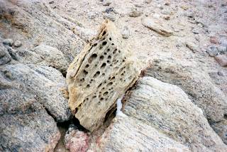 Как и на Новолазаревской, столкнулись со следами ветровой эрозии, которая здесь заявляла о себе с ещё большей силой. Среди наших станций на побережье район станции Молодежная славится самыми сильными ветрами. Скорость ветра здесь достигает зимой 60 метров в секунду! Диориты, граниты, гнейсы и другие твердые породы высверливаются и обтачиваются ветром до такой степени, что, иногда встречая огромный камень, похожий из-за дырок на сыр, веришь в то, что это не кусок дерева, изъеденный термитами или осами только потому, что здесь нет ни дерева, ни термитов, ни ос, а одни камни. Слои слагающих скалы пород отпрепарированы так, что похожи, иногда, на неровно сложенные доски, где выступающие «доски» – это слои с большей твердостью, а утопленные с меньшей. Там же, где на поверхность выходят однородные гранитные породы они вылизаны ветром до состояния округлых шарообразных поверхностей. Жилы во вмещающих породах тоже, как правило, препарированы. Если наполнение жилы тверже окружающей породы, то она выпирает из нее, а если мягче, то углубляется, образуя канаву. Здесь же я впервые увидел прекрасные образчики дресвы: россыпь осколков сильно выветрелой породы, имеющих вытянутую иглообразную форму – действительно похоже на вытянутые полусгнившие куски трухлявого дерева, валяющегося, где-нибудь в лесу средней полосы.
