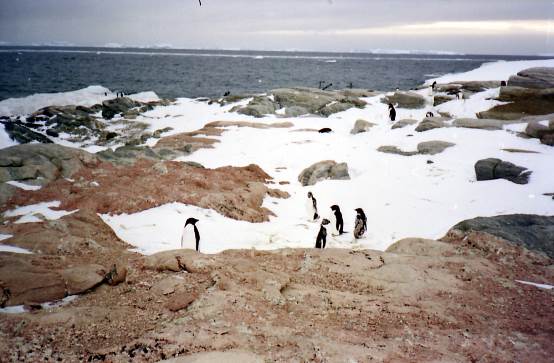 36. Группа пингвинов Адели на берегу среди скал