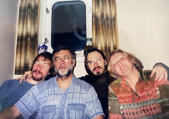37. Группа исследователей на отдыхе в каюте НЭС «Академик Фёдоров» после трудового дня. Слева направо: А.Новигатский, С.Тамбиев, Д.Айбулатов и О.Воскобойникова