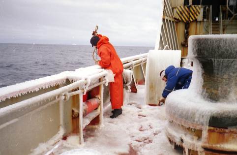 38. Отбор проб поверхностной морской воды в мороз на обледенелой палубе.