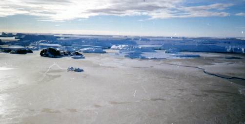 6 Апреля 2003 г., воскресенье – День Геолога. (66о04,03’S; 93o33,40’E, гл. 625 м.). Судно: 281о, 14,9 узлов. Ветер 101о; скорость 19 м/сек, Т воздуха = -13,5оС, Т воды -2,4оС Р= 975 НРА. Пасмурно. Идем сквозь сплошные поля молодого льда. Иногда это блинчатый лед, а иногда это просто ровный тонкий лед серого цвета, без заметной текстуры, кое-где рассеченный трещинами. Лед еще настолько тонкий, что колышется под воздействием волн. С утра опять наблюдали миражи айсбергов в большом количестве. Иногда даже и разобрать трудно, где реальные айсберги, а где миражи. В этом случае помогает бинокль.