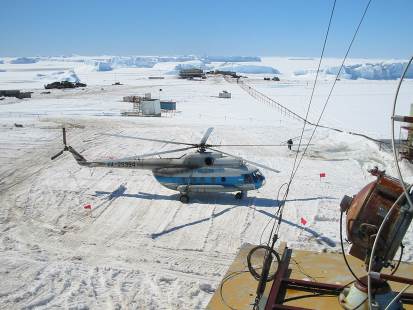 16 Апреля 2003 г., среда (70о01,39’S; 12o15,96’E, гл. 232 м). Судно в дрейфе. Ветер: 110о; скорость: 21,7 м/сек, Т воздуха = -8оС, Т воды = -2,5оС Р= 965 НРА. Стоим в чистой воде по которой проходят полосы снежуры. Летчики, несмотря на сильный ветер, все-таки собрали вертолет и после обеда слетали на Новолазаревскую за больным. Сейчас он уже на борту. Под сильным нажимом Инны и Ольги мы сделали пытку забросить с кормы сеть Джеди и отобрать планктон. Ничего не получилось. Из-за ветра сеть сильно сносило, и она не хотела заглубляться, а попытки половить планктон с поверхности привели только к отлову битого молодого льда, который тут же плотно забил стакан, закреплённый в нижней части сети и предназначенный для сбора пробы планктона.