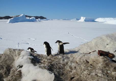 75. Пингвины Адели удирают от нас вниз по склону к припаю