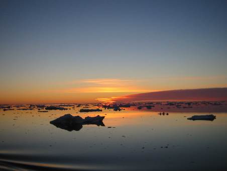 Сразу после чая по радио торжественно объявили, что работы на станции Мирный закончены и судно направляется в море Лазарева для выполнения гидрологических работ. Начали продираться сквозь строй айсбергов безмолвно застывших во всей своей ледяной красе по левому и правому борту. Часть айсбергов вдали, на горизонте были реальными, а другая часть, при ближайшем рассмотрении, оказалась миражами. Наверное, для усиления эффекта расставания, Антарктида решила преподнести нам свой последний подарок. Айсберги и кромка барьера вдоль Мирного были окрашены лучами заходящего солнца в нежнейший розовато-оранжевый цвет, в затененных местах переходящий в голубой. Попрощаться с Антарктидой и полюбоваться на такую красоту на палубу вышли почти все члены экспедиции. Все оживлённо переговаривались друг с другом, фотографировались. И мы решили, пофотографироваться на корме, на фоне этой красоты на цифровую камеру, которую Денис выпросил у гидрооптиков. Впоследствии выяснилось, что материализовать эту красоту не удалось – фотографии получились какими-то темными и невыразительными. Антарктида не захотела расставаться со своими сокровищами. Зато в памяти нашей она осталась во всей своей красе.