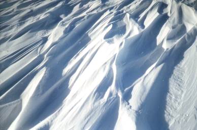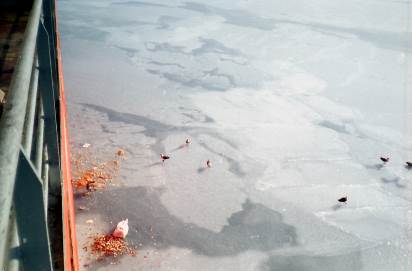 15 Апреля 2003 г., вторник (70о01,39’S; 12o15,96’E, гл. 450). Дрейфуем со льдами. Ветер: 103о; скорость: 26 м/сек, Т воздуха = – 8оС, Р= 966 НРА. Снег, метель. Видимость не более 100 м. Под утро я проснулся от жуткого скрежета и грохота. Оказалось, что ветер и волны стали надвигать на нас лед и эти звуки издавали льдины, которые со скрежетом терлись о борт «Федорова» и ломались с громким грохотом и хрустом. В данном случае это не опасно, т. к. это молодой лед толщиной всего 15–20 см, а вот когда судно затирают льды толщиной 2–3 м, это уже на много хуже. После завтрака судно сделало циркуляцию вокруг ледяного поля и опять легло в дрейф. Вокруг все бело. Небо ото льда невозможно отличить по цвету, горизонта не видно. Ветер так раскачал море, что зыбь ощущается даже во льдах, где мы стоим, чувствуется как судно качает. Ураганом покололо лед, и льдины наехали друг на друга, образовав что-то похожее на мелкие торосы.