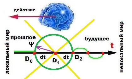 Представим, что не мозг движется «спиной» по стреле времени, а время проходит сквозь него, т.е. стрела времени движется в том же направлении, что и его собственное действие (можно тогда понять, почему природа следует принципу наименьшего действия, положенному в Лагранжев формализм: квантовое действие всегда минимально, сумма таких минимумом тоже минимальна). Поскольку физическое прошлое D0 уже есть в настоящей дхарме D1, а физического будущего D2 еще нет, но оно возникает спонтанно с непрерывным движением времени, то опережающая волна в динамике сдвигается назад (гасится в электродинамике Уилера-Фейнмана), образуя вместе с отстающей волной временную петлю вокруг мгновенного настоящего.