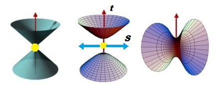 В релятивизме нас в первую очередь интересует именно 2-листный несвязный гиперболоид. Его называют еще квази-сферой (но не псевдосферой!), поскольку он обладает некоторыми общими свойствами с ней. В частности, его Гауссова кривизна оказывается положительной, как и у сферы, при том что кривизна «s-подобного» гиперболоида отрицательна. Более обще: в 4-мерном пространстве (w, x, y, z) две конические гиперповерхности, представленные тождественными квадратичными формами с разницей лишь в знаке, при пересечении их гиперплоскостью w = r, дают сферу и гиперболоид соответственно.