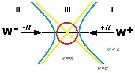 Для удобства обозначим световые конуса будущего и прошлого в пространстве Минковского М как и соответственно. 1-листный и 2-листный гиперболоиды выразим через и . Т.о. пространство М в метрике (2.1) состоит из двух световых конусов и s-подобной области S, а в метрике (7.8) разлагается в три области, поскольку не является односвязным.