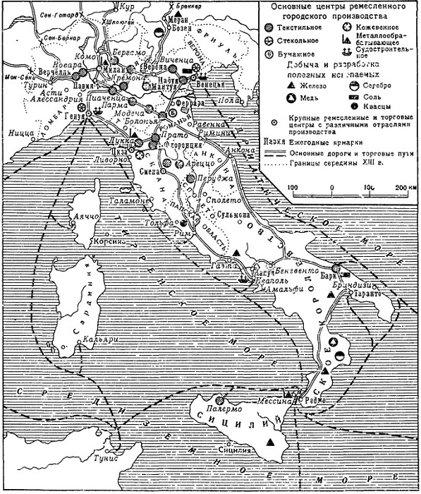Только самые крупные города, имевшие главные экономические интересы вне Италии (на Востоке и в Европе), – Флоренция, Венеция, Генуя, располагавшие огромными ресурсами, могли до поры до времени меньше считаться с интересами округа. Большинство же городских коммун находилось в ином положении, и даже такой крупный центр, как Милан, все больше превращался в XIII в. в экономический центр Ломбардии.