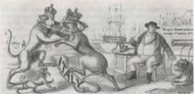 Английская карикатура «Трубка мира»: Боевые собаки – Франция и Австрия – дерутся за кость; Англия в стороне