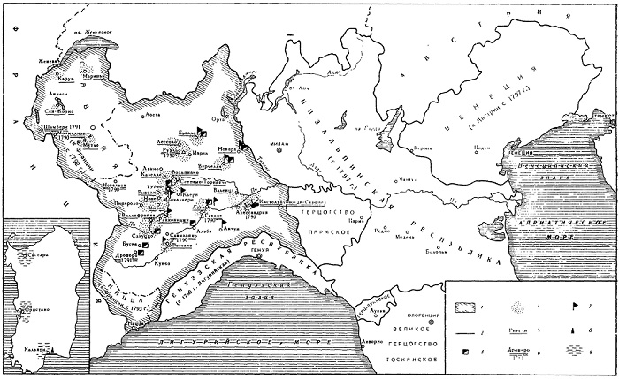 Народные движения в Сардинском королевстве в 90-х годах XVIII в. 1. Основная территория Сардинского королевства. 2. Границы итальянских государств. 3. Основные центры республиканского заговора в 1793–1794 гг. 4. Районы крестьянских волнений. 5. Места антифеодальных выступлений и хлебных бунтов крестьян. 6. Места и даты вооруженных столкновений крестьян и горожан с королевскими войсками и полицией. 7. Центры народного восстания в Пьемонте в 1797 г. 8. Центр антипьемонтского восстания на Сардинии в 1794 г. 9. Районы антифеодального движения на Сардинии в 1794–1796 гг.