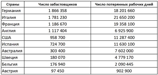 Однако социалисты продолжали отказываться от каких бы то ни было форм сотрудничества с любой буржуазной политической группой. Но единственной альтернативой сотрудничеству был курс на решительное революционное выступление. Несмотря на поражение туринской забастовки в апреле – что было грозным симптомом для рабочего движения, – в целом это движение в течение всего первого полугодия 1920 г. шло еще по восходящей линии. Приводимая ниже мировая статистика забастовок за первое полугодие 1920 г. показывает, что по отношению к численности населения забастовочное движение в Италии в этот период было самым сильным в мире[46].