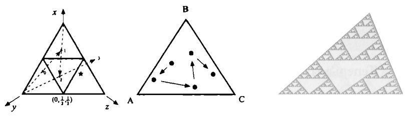Рассмотрим еще один способ применения системы итерируемых функций. Возьмем кость. Вместо цифр 1, 2, 3, 4, 5, 6 на шести гранях нанесем всего три буквы х, у, z. Каждая из них будет повторяться дважды. На листе бумаги нарисуем треугольник, вершины которого обозначим теми же буквами х, у, z. Перед началом игры внутри треугольника отмечают произвольную начальную точку. После первого броска расстояние от исходной точки до вершины треугольника, обозначенной буквой, выпавшей при бросании кости, делят пополам и наносят первую точку. Далее алгоритм повторяется от этой точки и т. д. Постепенно на листе бумаги появляется известный фрактал Серпинского. Разумеется, для этой игры совершенно несущественно, чтобы исходный треугольник был равносторонним. С равным успехом «играть в хаос» можно с треугольником любой формы. Дело в том, что фрактал Серпинского является аттрактором для данного алгоритма.