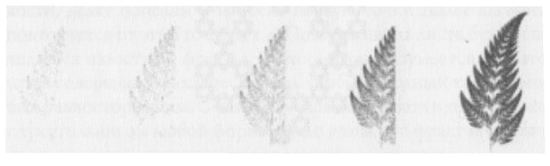 Лист папоротника. Слева направо показаны 2000, 4000, 10000, 50000 и 200000 итераций