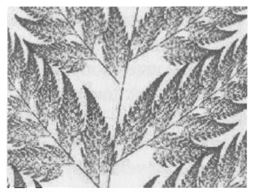 Видно, как с ростом числа итераций действительно возникает все более и более четкое изображение листа папоротника, удивительным образом напоминающее существующее в природе растение. Это множество точек бесконечно самоподобно, как и полагается всякому фракталу. Кроме того, разрешение образа достигается не за счет увеличения числа исходных данных, но за счет увеличения числа итераций. Всего лишь увеличив количество итераций – звучит здорово, пока не попробуешь проделать это на практике. Но труды стоят того: исходные 28 чисел содержат всю необходимую информацию о листе папоротника и о любом сколь угодно маленьком фрагменте этого листа.
