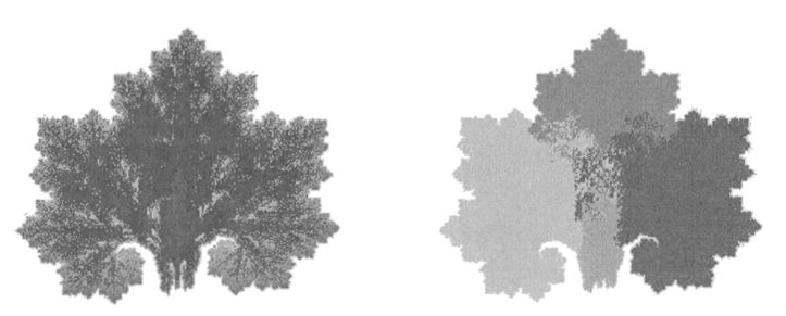 На нижнем рисунке показан образ кленового листа и также выделены зоны листа, произведенные каждым из четырех преобразований. Мы видим, что образ кленового листа формируется по большей части тремя фрагментами, похожими на кленовый лист в целом. Этот эффект есть следствие фрактального самоподобия.
