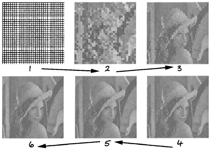 Декодирование же производится просто и довольно быстро. Берем любое изображение, делим на ранговые области, последовательно заменяем их результатом применения соответствующего преобразования к соответствующей доменной области (что бы она ни содержала в данный момент). После нескольких итераций исходное изображение станет похоже на себя.