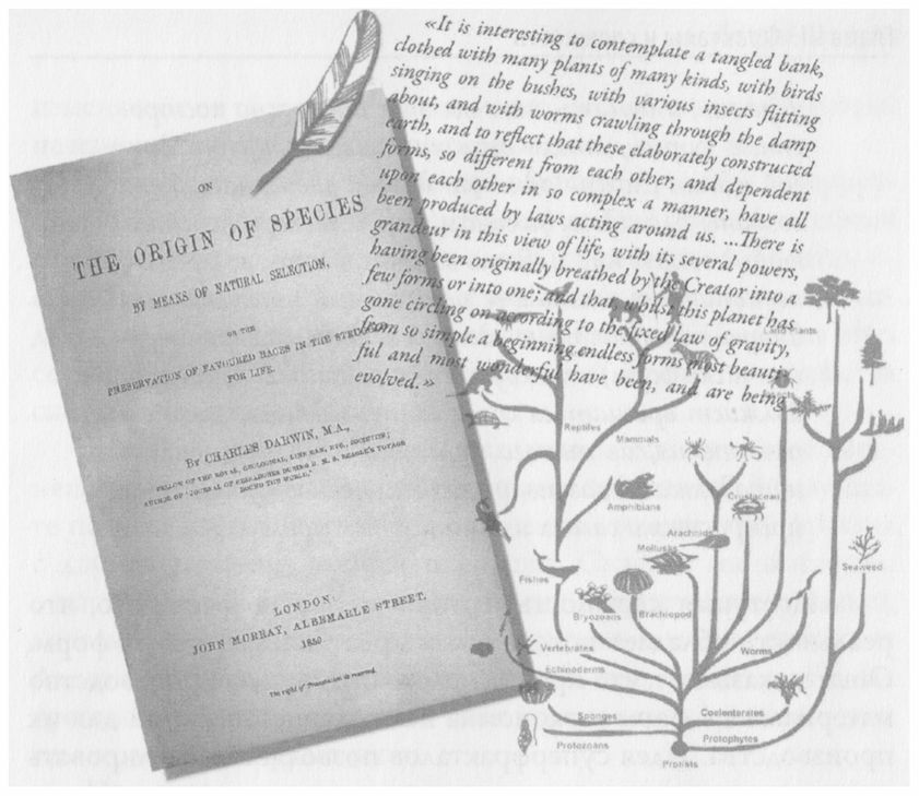 «Любопытно созерцать густо заросший берег, покрытый многочисленными, разнообразными растениями с поющими в кустах птицами, порхающими вокруг насекомыми, ползающими в сырой земле червями, и думать, что все эти прекрасно построенные формы, столь отличающиеся одна от другой и так сложно одна от другой зависящие, были созданы благодаря законам, еще и теперь действующим вокруг нас... Есть величие в этом воззрении, по которому жизнь с ее различными проявлениями Творец первоначально вдохнул в одну или ограниченное число форм; и между тем как наша планета продолжает вращаться согласно неизменным законам тяготения, из такого простого начала развилось и продолжает развиваться бесконечное число самых прекрасных и самых изумительных форм».