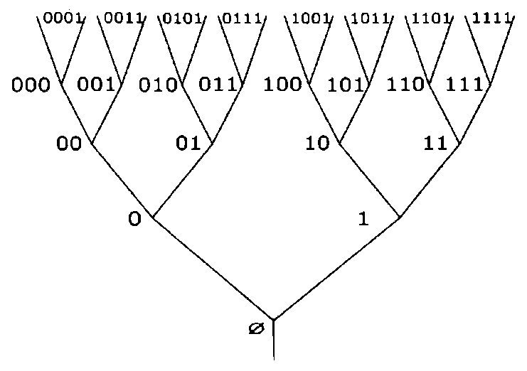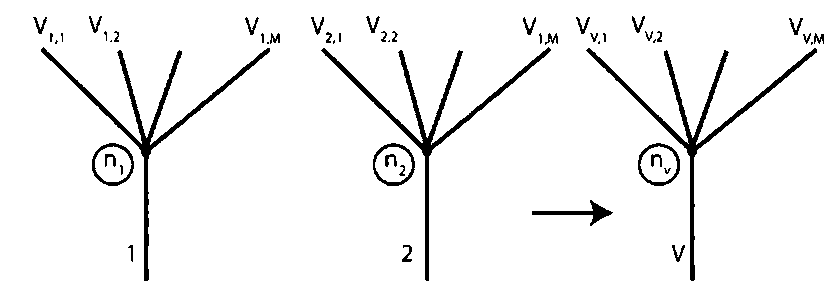 Для иллюстрации этих идей представим себе дерево, которое растет таким образом, что в каждом поколении его ветви расщепляются на V ветвей. Этот алгоритм роста назовем «V-изменчивым» (V-variability). Комбинаторика типовых ветвей может изменяться от поколения к поколению, но число типовых ветвей не изменяется и равно V (своего рода «ген»).