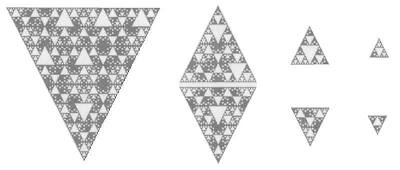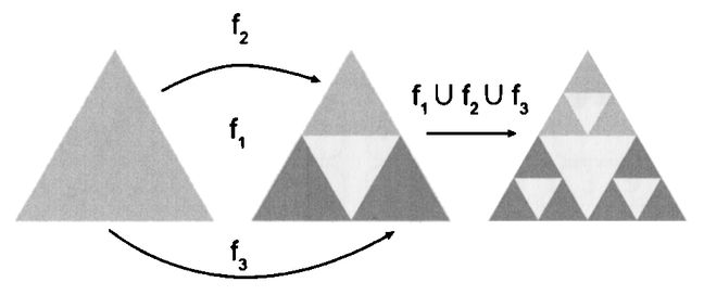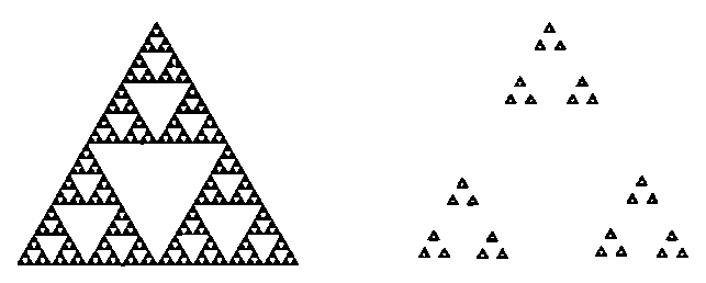 Для примера рассмотрим треугольник Серпинского. Построение треугольника Серпинского можно описать простым геометрическим алгоритмом. Для начала из правильного треугольника удалим среднюю четверть в виде подобного ему правильного треугольника. С оставшимися тремя треугольниками повторим ту же процедуру. И так далее – с остающимися на каждом шаге треугольниками поступают аналогично.