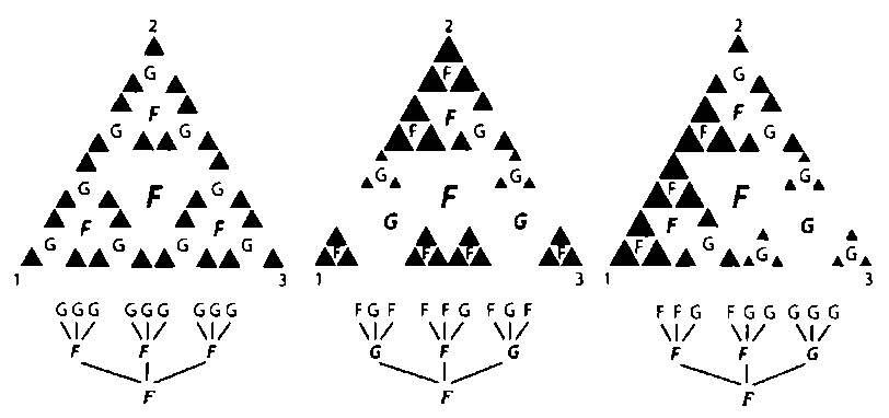 Добавим вторую систему итерированных функций, точно такую, как и первая, но основанную на отношении 1/3. Обозначим эту систему как G. Пусть обе системы имеют одни и те же фиксированные точки исходного треугольника. Их аттракторы SF:F (1/2) и Sg: G (1/3) показаны на рисунке.