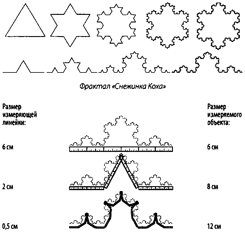 Мандельброт понимал, что эта скорость равна степени извилистости фрактальной структуры. Такое интуитивное представление кажется очевидным. Продолжая поиски степени извилистости фрактальных форм, Мандельброт пришел к идее, которая далеко не очевидна. Он обнаружил, что степень извилистости описывает размерность Хаусдорфа – Безиковича.