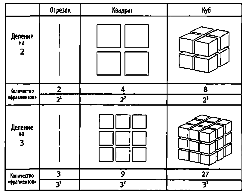 Например, если разделить одномерный отрезок пополам, то получим два сегмента (коэффициент сокращения ƒ = 1/2). Если разделить двухмерный квадрат на «подквадраты» с половинной длиной стороны (коэффициент сокращения опять же ƒ = 1/2), то получим 4 = 22 квадрата. Если же мы возьмем длину стороны в 1/3 первоначальной (ƒ = 1/3), квадратов станет 9 = З2. Если же мы поступим так же с трехмерным кубом, то деление ребра пополам (ƒ = 1/2) даст нам 8 = 23 кубиков, а ребро в 1/3 первоначального – 27 = 33 кубиков. Если изучить все эти примеры, обнаружим, что между количеством «фрагментов» n, коэффициентом сокращения длины ƒ и измерением D есть определенная взаимосвязь. И вот какая: