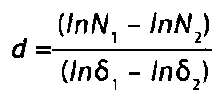 размерность d может быть представлена отношением ln(N) к ln(δ). Рассчитать размерность d можно по двум точкам (N1, δ1)и (N2, δ2):