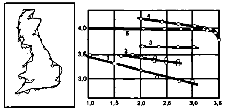 Алгоритм определения фрактальной размерности обычно сводится к следующему. Строится график зависимости N от δ в логарифмических координатах. Точки на графике обычно ложатся на отрезок прямой, угол наклона которой и равен d (см. рисунок). Например, размерности прибрежных пограничных кривых для западного побережья Норвегии – 1,52; для Великобритании (линия 1) – 1,25; для Германии (линия 2) – 1,15; для Австралии (линия 3) – 1,13; для сравнительно гладкого побережья Южной Африки (линия 4) – 1,02 и, наконец, для идеально гладкой окружности (линия 5) – 1,0.