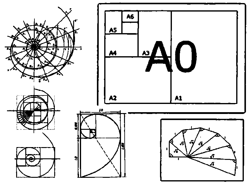 Мы регулярно сталкиваемся с ним при использовании листов формата А – A3, А4, А5, но мало кто знает, что их соразмерность достигается притом, что их стороны друг с другом несоизмеримы. Нельзя найти такой меры длины, которая укладывалась бы целое число раз по периметру всех известных форматов. И это связано с тем, что соотношение сторон листов формата А равно иррациональному числу 1,4142... Так, для формата А4 это 210х197 мм: 210/197 = 1,4142... Для формата А5 – 197x148 мм: 197/148 = 1,4142... и так далее. При этом, как видно из рисунка, все форматы соразмерно размещаются на листе мастер-формата АО.