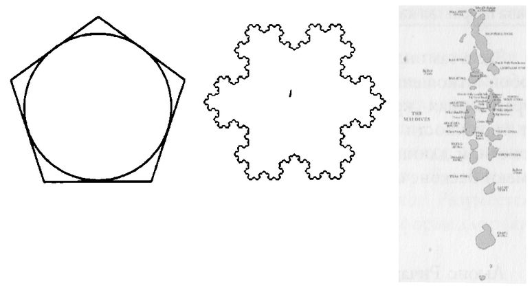 Слева направо: окружность, вписанная в пятиугольник; остров Коха; побережье Мальдив