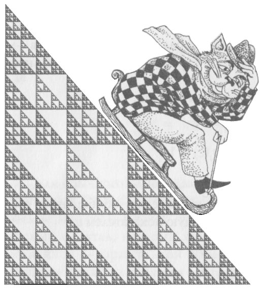 Пример 5. Мультифрактал СерпинскогоРассмотрим треугольник Серпинского, построенный с помощью СИФ. Система итерируемых функций для этого фрактала состоит из трех преобразований на комплексной плоскости, каждое из которых выбирается с одинаковой вероятностью, равной 1/3. Допустим, однако, что в методе случайных итераций мы теперь по какой-то причине отдали предпочтение одной из вершин треугольника и стали выбирать ее с вероятностью 90%. Две же остальные вершины равноценны, и на их долю приходится по 5%. Точки внутри треугольника распределены теперь крайне неравномерно. Тем не менее основное свойство фрактала – самоподобие – по-прежнему соблюдается, фрактальная размерность сохраняется: