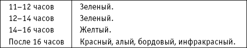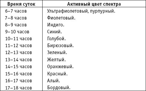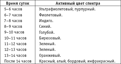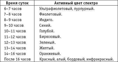 Зная спектральное «расписание», можно целенаправленно лечиться цветом, облучая себя солнечным светом в определенное время суток. Период выбирается в зависимости от того, каких изменений в своем самочувствии вы хотите достичь.