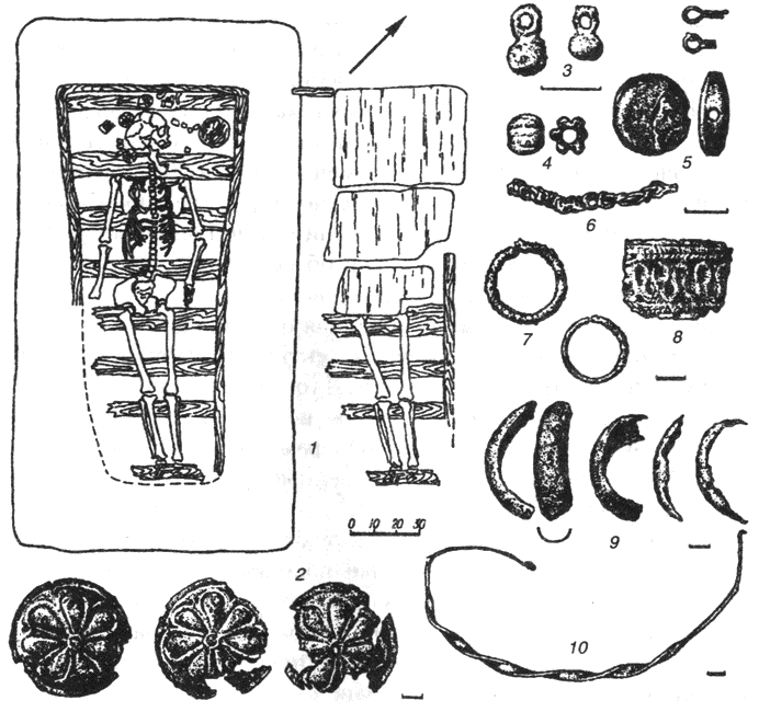 Половецкое погребение XII—XIII вв.: 1 – погребение с остатками гробовища; 2 – полусферические бляхи, плакированные золотом в виде семилепестковых розеток; 3 – бронзовые пуговицы; 4 – пастовая бусина; 5 – янтарная бусина; 6 – серебряная цепочка; 7 – серебряные колечки; 8 – бронзовая, плакированная золотом пластина; 9 – бронзовые, плакированным золотом дуговидные пластины; 10 – серебряная шейная гривна. Город Орджоникидзе Днепропетровской области