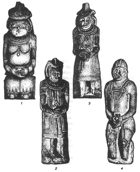 Половецкие статуи: 1 – Краснодарский край, станица Старая Леушковская. Краснодар. Краеведческий музей; 2 – Донецкая область, Артемовский район, село Ступки. Москва. Государственный исторический музей; 3 – Донецкая область, Артемовский район, село Скотоватое. Москва. Государственный исторический музей; 4 – Донецкая область, Артемовский район, село Ступки. Москва. Государственный исторический музей. Материал всех статуй – песчаник