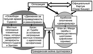 Наконец, «Движение за справедливость и равноправие» (расово также в основном негроидное) получает спонсорскую помощь и «идеологическую подпитку» от структур «Народного конгресса» бывшего спикера парламента (и недавнего фактического теневого «хозяина» страны) Хасана ат-Тураби, отстраненного от власти нынешним президентом Судана Баширом в 2000 году. А также – из соседнего Чада.