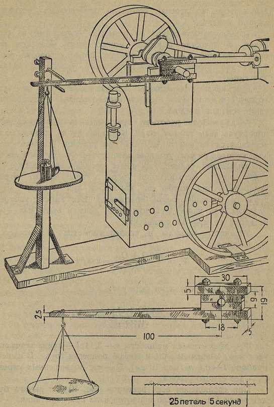 Для определения числа оборотов машины приклейте сургучом на шкив на расстоянии 5–8 мм от центра вала кусочек заостренного графита от карандаша. При вращении машины графит будет описывать окружность. Из белой бумаги вырежьте ленту шириной 20 мм, длиной 300–400 мм. Возьмите ленту в руки, приложите ее к графиту и проведите перед ним. Графит начертит на ленте вереницу петель (рис. 10, внизу). Каждая петля будет соответствовать одному обороту вала.