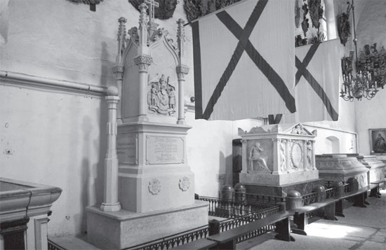 Саркофаги адмиралов И. Крузенштерна и С. Грейга в Домском соборе в Таллине под сенью Андреевского флага. Саркофаг С. Грейга выполнен по эскизу Дж. Кваренги.