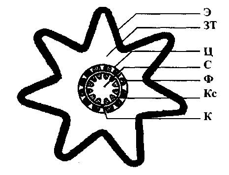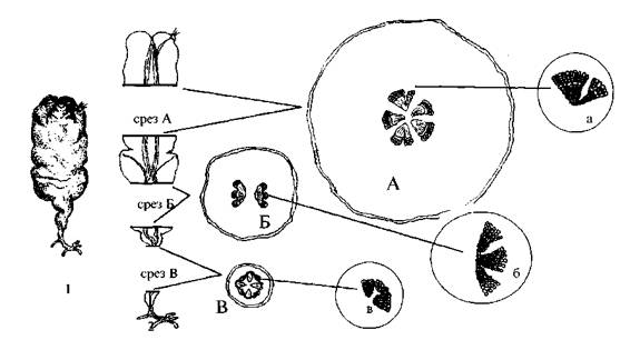 Рис. 8. Рисунок-схема строения центрального цилиндра (стелы) Lophophora diffusa (1). На осевом срезе (2) видно сужение центрального цилиндра в зоне гипокотиля. На поперечном срезе корня (В) отчетливо видно 4 сегмента.