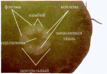 В центре камбиального кольца расположены клетки сердцевины, а пространство от камбиального кольца до внешних покровов – эпидермиса занято паренхимной запасающей тканью, представляющей собой разросшиеся клетки первичной коры (т.е. той тоненькой кожицы, которая покрывает зародыш семени). Цитоплазма клеток этой ткани студенистая, в виде густого коллоида, что способствует быстрому всасыванию воды, особенно конденсированной (росы), удержанию ее в клетке. Густая цитоплазма обеспечивает сильный ток воды и минеральных веществ от корня в стебель.