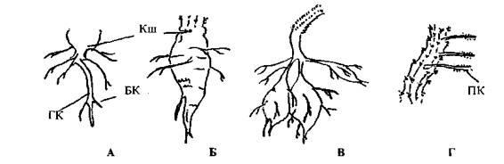 (Кш – корневая шейка, ПС – главный корень, БК – боковые корни, ПК – придаточные корни).