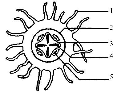 От центрального цилиндра к ареолам отходят проводящие пучки. Проводящих пучков в стебле мало, они простые, с преобладанием флоэмы, поэтому движение питательных веществ и воды в толще стебля чаще происходит путем осмоса, т.е. пассировки их от клетки к клетке.