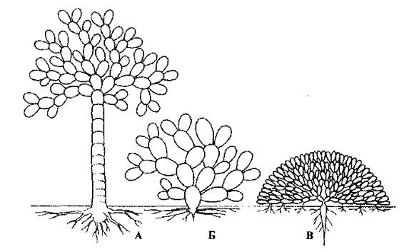 Рис. 9, Форма стебля у опунциевых кактусов: А – древовидная; Б – кустовидная; В – подушковидная (по W.Rauh).