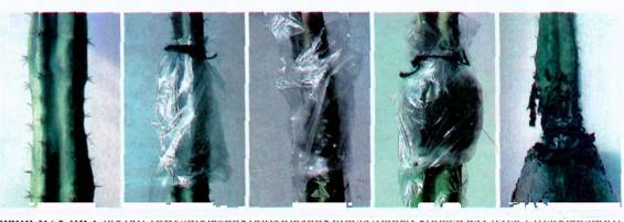 Фото 312 – 316. Способ стимулирования образования придаточных корней на стебле столбовидного кактуса (Trichocereus neolamprochlorus). Описание методики см. в тексте.