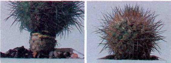 Фото 335 – 336. Импортное растение Gymnoculyciwn /wav///, у которого во время транспорировки была повреждена корневая система и нижняя часть стебля, привито способом «прививка корнем» на заранее подготовленный эхинопсис.