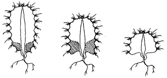 Рис. 75. Схема поэтапной хирургической операции по укорачиванию стебля кактуса путем срезания части запасающей ткани.